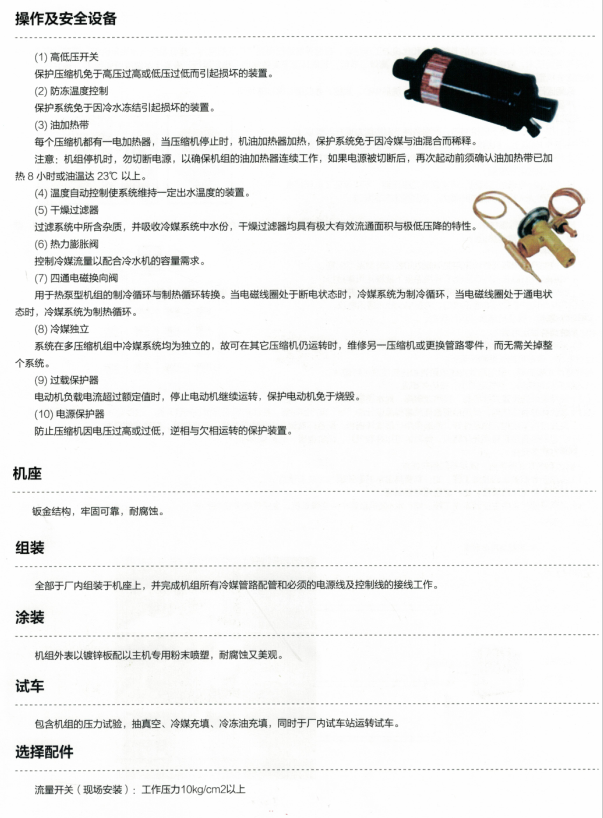 ①機組所用制冷系統配件全部選用名牌廠家的產品,如可拆式干燥過濾器、外平衡式熱力膨脹閥、供液電磁閥、視液鏡、高、低壓力控制器、排氣溫度控制器等均采用世界一流的名牌廠家的產品,確保機組具有較高的性能水平。
