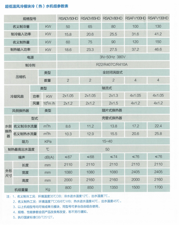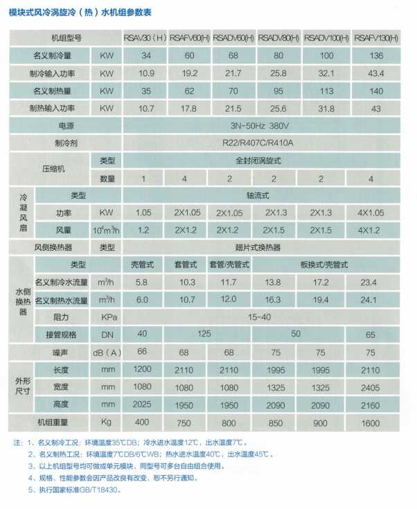 風冷熱泵機組產品種類及規格: