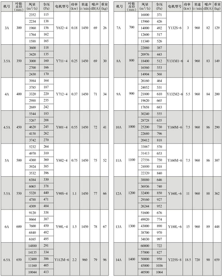 GXF系列斜流式通風機性能參數表