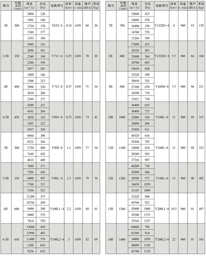 GXF-B型斜流式通風機性能參數表