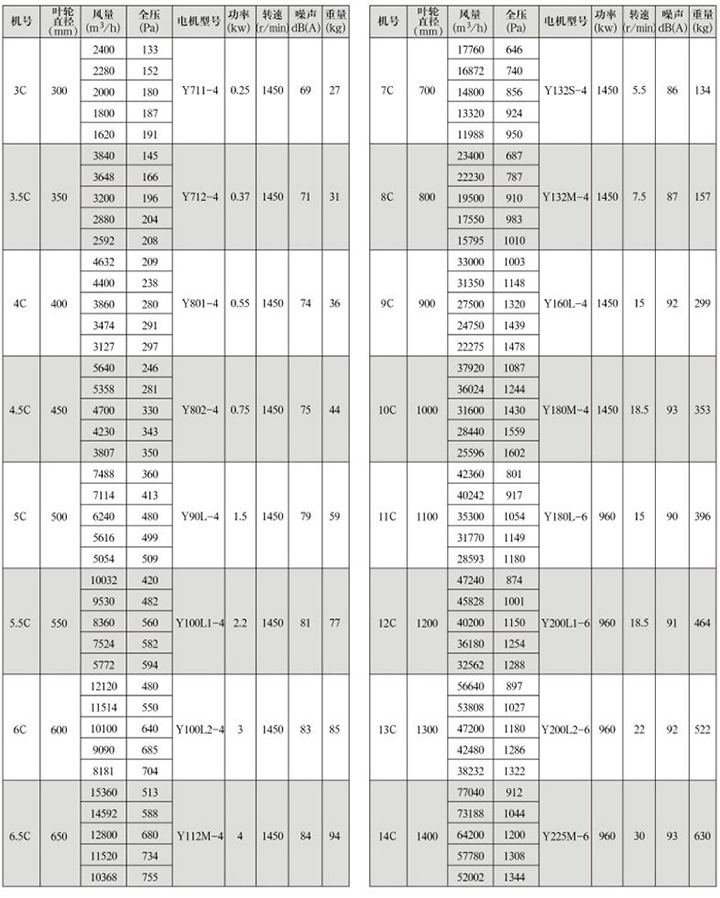 GXF-C型斜流式通風機性能參數表