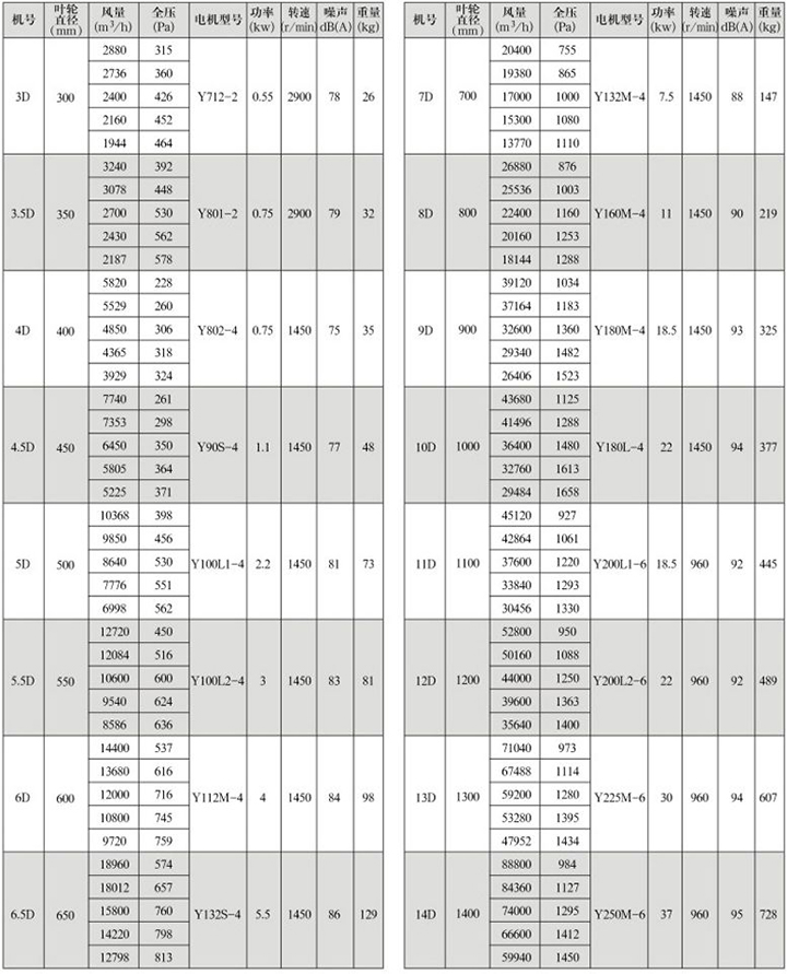 GXF-D型斜流式通風機性能參數表