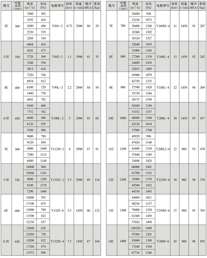 GXF-E型斜流式通風機性能參數表
