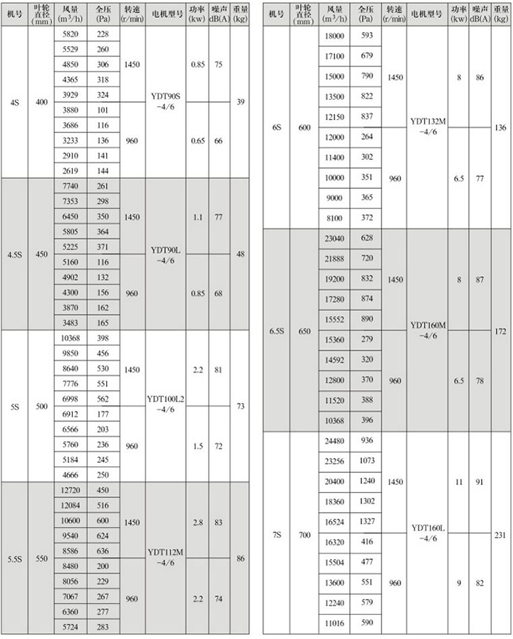 GXF-S型雙速斜流式通風機性能參數表(1)