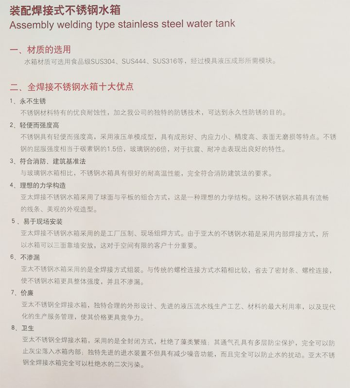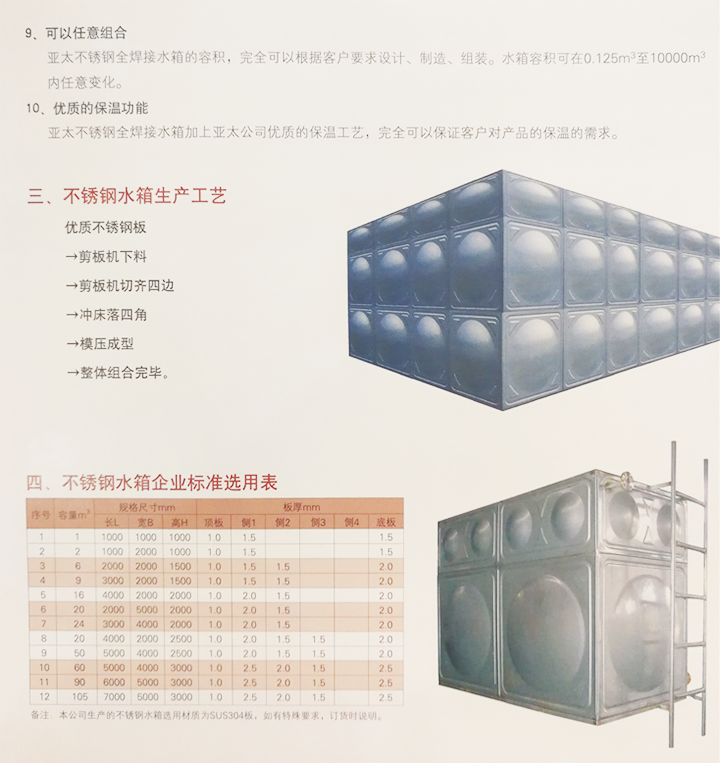 不銹鋼水箱十大優(yōu)點(diǎn)分析 1、永不生銹,不銹鋼材料特有的優(yōu)良耐腐蝕性,加之我公司獨(dú)特的防銹技術(shù),可達(dá)到永久性防銹的目的。 2、輕便且強(qiáng)度高,不銹鋼具有輕便且強(qiáng)度高,采用液壓單模成型,具有成形好、內(nèi)應(yīng)力小、精度高、表面無磨損等特點(diǎn)。不銹鋼的屈服強(qiáng)度相當(dāng)于碳素鋼的1.5倍,玻璃鋼的6倍,對于抗震、耐沖擊表現(xiàn)出良好的特性。 3、符合消防、建筑基準(zhǔn)法,與玻璃鋼水箱相比,不銹鋼水箱具有良好的耐高溫性能,完全符合消防建筑法的要求。 4、理想的力學(xué)結(jié)構(gòu),該系列全焊接不銹鋼水箱采用了球面與平板的組合方式,這事一種理想的力學(xué)結(jié)構(gòu)。這種不銹鋼水箱具有流暢的線條、美觀的外觀造型。 5、易于現(xiàn)場安裝,該系列焊接不銹鋼水箱采用的是工廠壓制、現(xiàn)場組焊的方式,由于本公司生產(chǎn)的不銹鋼水箱是采用內(nèi)部焊接方式,所以水箱可以三面靠墻安放,這對于空間有限的客戶十分重要。 6、不滲漏,本公司生產(chǎn)的不銹鋼水箱采用的是全焊接方式組裝,與傳統(tǒng)的螺栓連接方式水箱相比較,省去了密封條、螺栓連接,使不銹鋼水箱更具整體強(qiáng)度,并且不滲漏。 7、價(jià)格實(shí)惠,本公司生產(chǎn)的不銹鋼全焊接水箱,獨(dú)特合理的外形設(shè)計(jì)、先進(jìn)的液壓流水線生產(chǎn)工藝、材料的最大利用率,以及現(xiàn)代化的生產(chǎn)服務(wù)管理,使其價(jià)格更具競爭力。 8、衛(wèi)生,該型不銹鋼水箱采用的是全封閉方式,杜絕了藻類繁殖,其通氣孔具有多層防塵保護(hù),完全可以防止灰塵落入水箱內(nèi)部,獨(dú)特先進(jìn)的進(jìn)水裝置不但具有減少噪音功能,且可以防止水的擾動。中大不銹鋼全焊接水箱完全可以杜絕水的二次污染。 9、容積大小可變,該系列水箱容積玩去哪可以根據(jù)客戶要求設(shè)計(jì)、制造、組裝。水箱容積可在0.125m3至10000m3之間任意變動。 10、優(yōu)質(zhì)的保溫功能,先進(jìn)保溫工藝搭配優(yōu)質(zhì)保溫材料,完全可以保證客戶對產(chǎn)品的保溫的需求。 不銹鋼水箱常見的有不銹鋼消防水箱,方形組合式水箱、立式圓形水箱、臥式圓形水箱。采用SUS304、SUS316L、SUS444等不銹鋼板,沖壓成型。一般沖壓成三種尺寸,分別是1x1米、1x0.5米和0.5x0.5米三種,周邊用鎢極氬弧焊接,具有強(qiáng)度高、重量輕、成本低、環(huán)保衛(wèi)生等特點(diǎn)。制造標(biāo)準(zhǔn)為國家建筑標(biāo)準(zhǔn)02s101設(shè)計(jì)圖集。
